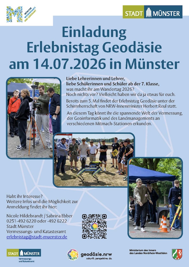 Ausgerichtet wird der Erlebnistag Geodäsie 2026 von der Stadt Münster in Kooperation mit dem Ministerium des Innern des Landes Nordrhein-Westfalen.